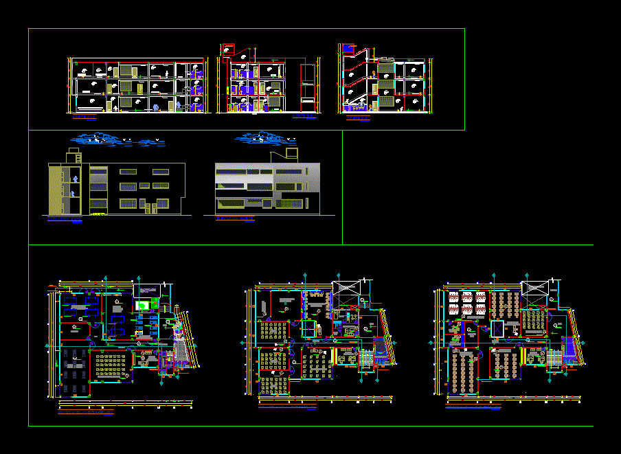 HALL G (3 times) of the College of Polytechnic Regional Centre - plants - sections - elevations - Details