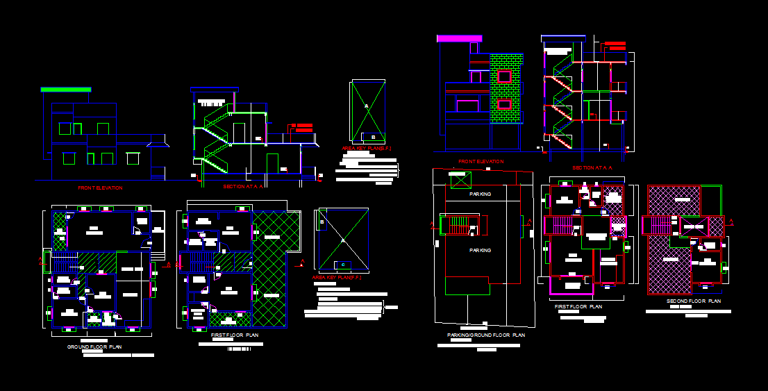 2 family bungalow with all levels of network studies. Fully developed plans. Elevations and sections with family, bungalow, plot area, according to the calculations of floor plans
