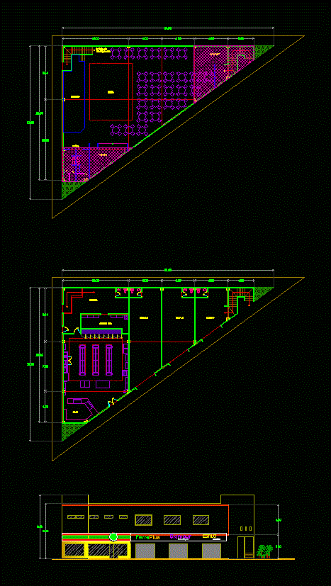 Comercial OXXO exterior architectural plan type. Bounded scales, furniture, human-scale commercial real