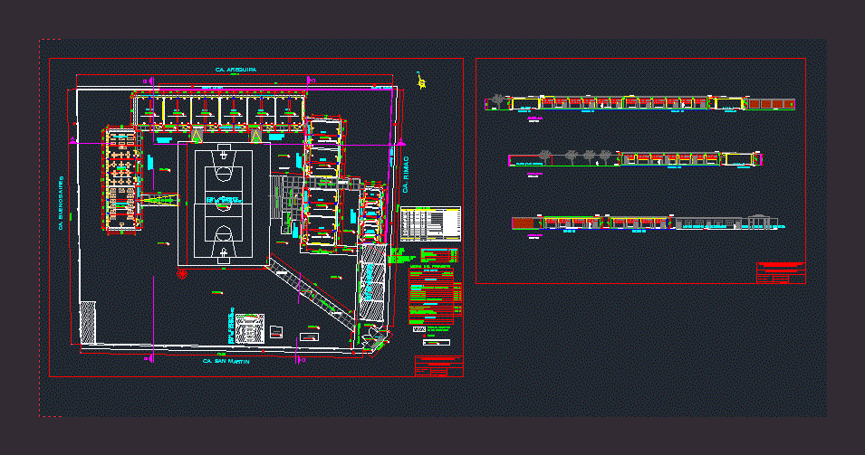 Architectural drawing of a school, around u inch or distributed furniture with three blocks, including a multi-purpose sports ground shown from lifts and cuts
