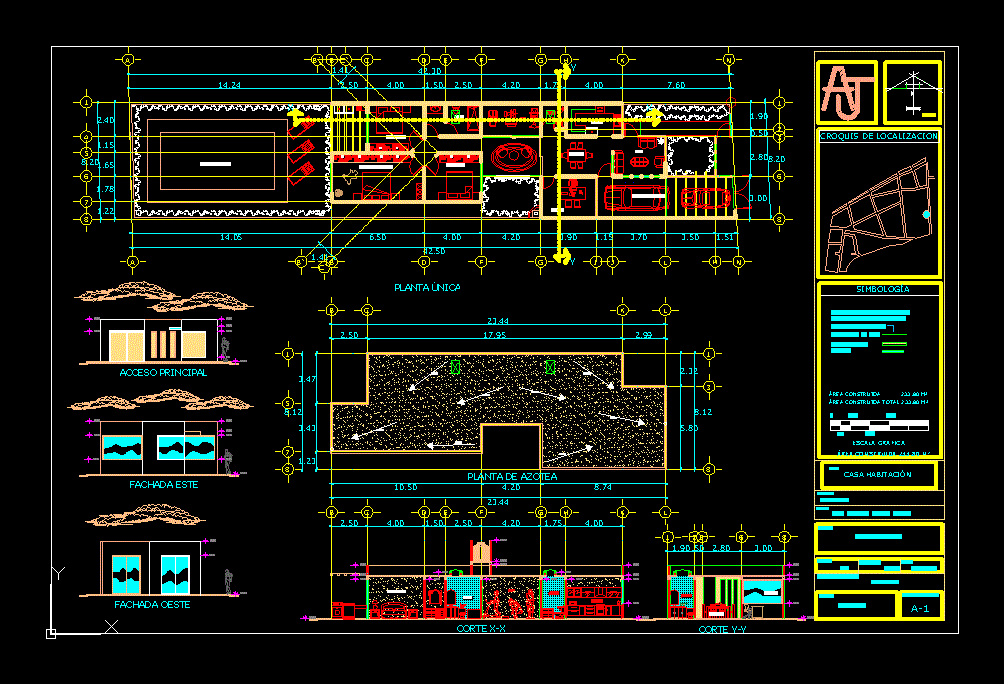 Full transverse and longitudinal sections, architectural House plan three facades, roofs and ground floor plan the dimensions and levels of the axis there is a room.