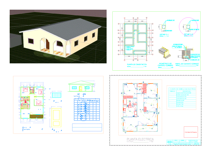 Low-income people housing, two bedrooms, bathroom, living room, kitchen and dining room. Plans, architectural plans, electrical plans, Basic plan, facade and 3D drawings.