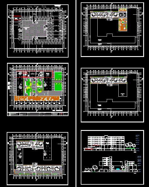 Multifamily housing project, the inner Square, box office, parking lot for cars consists of 120 level 6 common areas, gym on the first Level, 2 cuts of communal areas detailed.