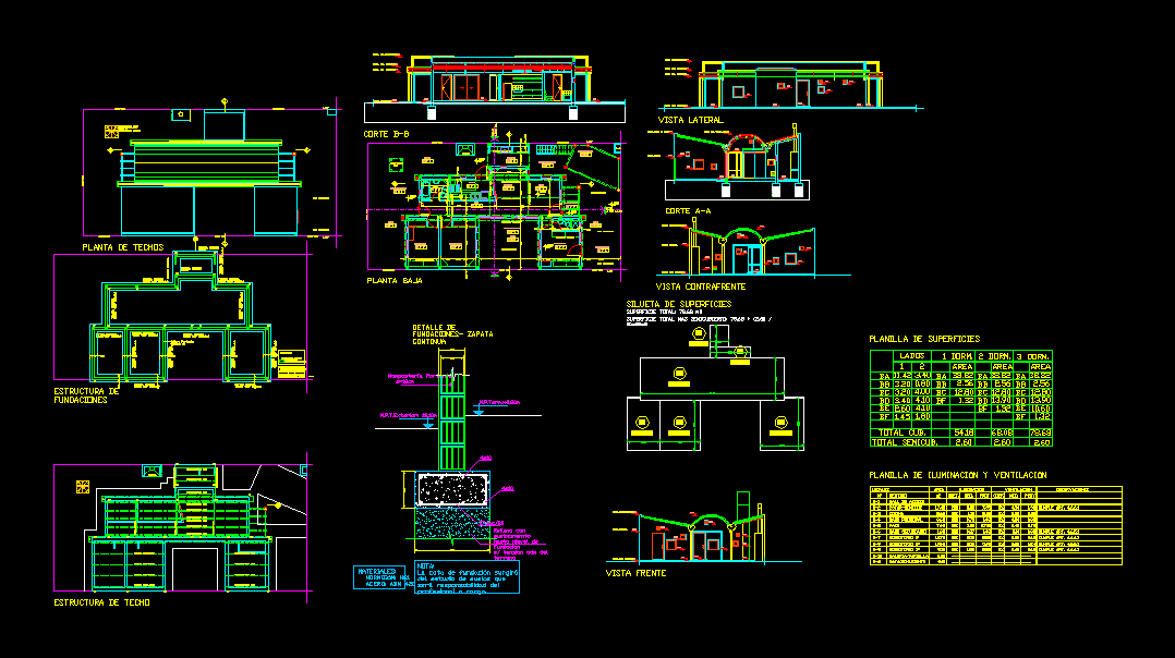 A plant with curved and sloping ceilings housing a rainy area, three bedrooms, two bathrooms, kitchen, dining and living, architectural plans, structures, cuts, facades and details with housing