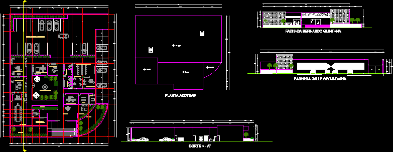 Architects Center projects with furniture, axes, dimensions, and cut two walls, flat roofs, their names are found in each room, waiting room, reception, meeting room etc.