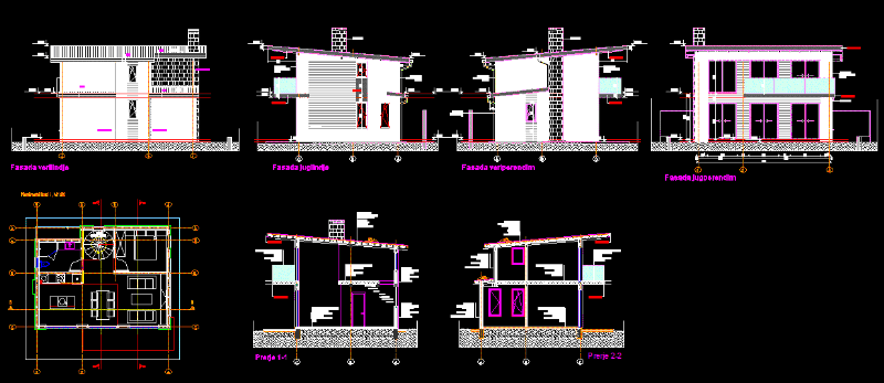 Beach house with wood construction - plants - sections - elevations