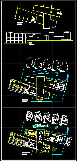 Motel architectural design, reception, restaurant, rooms and bungalows, kitchen and services presentation of the project drawings