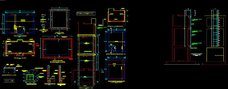 Overhead tank construction details, cat ladder, fence, Bridge Road. Colegio Las Mercedes: Plans, sections and elevations, architectural details, etc.