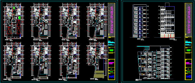 Plans, section and elevation of a multifamily building provides