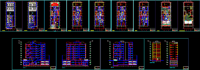 7-story multifamily building levels and 02 basement. Each level of window, floor, furniture, etc details.