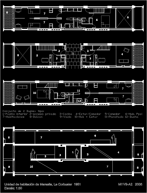 This file Autocad architectural plans, longitudinal and development process unit architect Le Corbusier in Marseille is talking some PDF files are included.