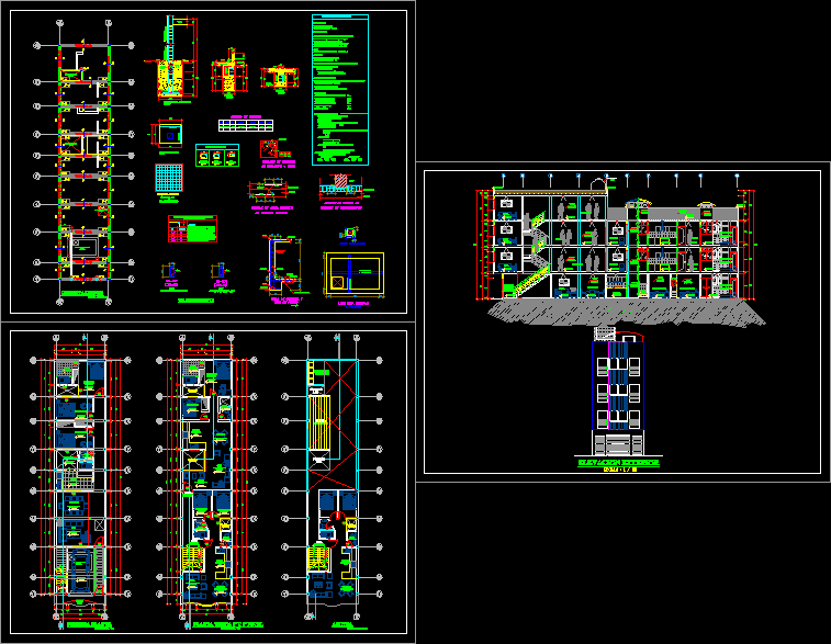 A family of 4 levels. Detailed plans, structures, Foundations, front view and a functional plan.