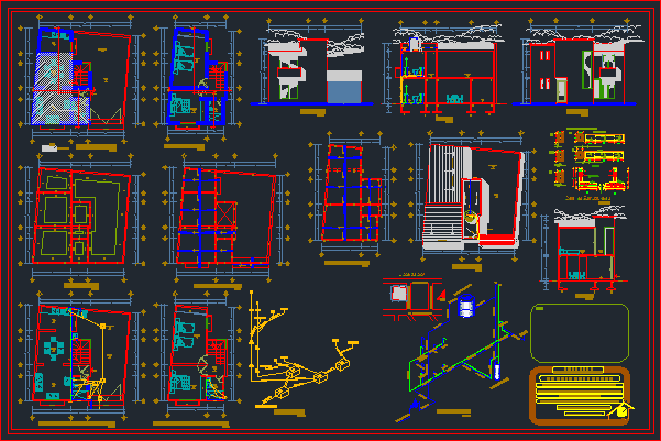 Architectural plans (low and high). basic, mezzanine, floor and roof structural plans. Water and plumbing installation details and isometric. What makes this very interesting it's a good organization and the location in the field. Also shown in front