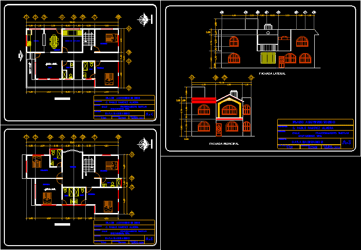 Architecture level 2-room house plant, level 1 (ground floor living room, dining room, kitchen, service meters, 2 bathrooms, 2 bedrooms and stairs nvel 2 (times) 4 bedrooms, terrace and bathroom and the main and side facades.