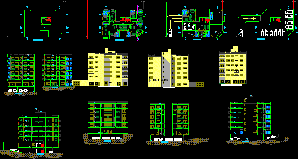 Architectural Building 5th floor floor 4 apartments with ground floor retail and underground parking Floor plans facades front and side number