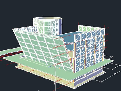 AutoCAD 3D building modeling laterally sloping forehead and a glazed cylindrical glazed Tower