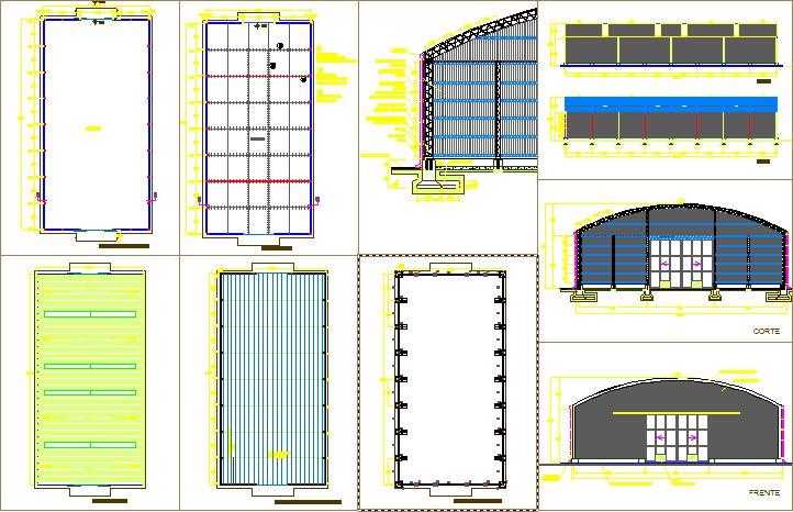 Shed Plans of 800 m2 plants with architectural sections and constructive details