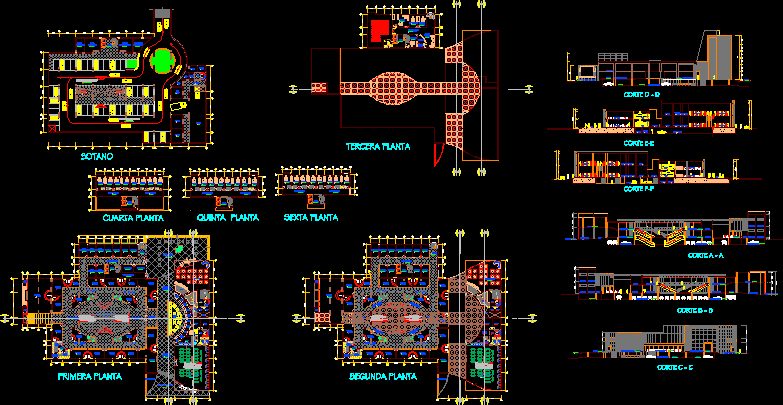AT EVERY LEVEL OF FOOD SERVICE MANAGERS AND MULTI-USE SHOPPING AREA ON TWO LEVELS ON THE THIRD FLOOR ABOVE THE PARKING OFFICE OR THREE LEVELS IN THE BASEMENT TRANSVERSE AND LONGITUDINAL SECTIONS
